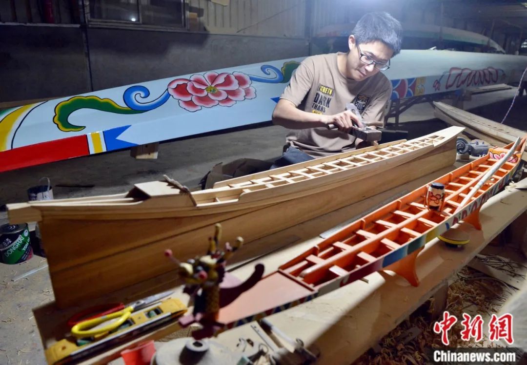 夜里,方莊龍舟制造技藝第四代傳人方劍偉正在制作“龍龍仔”。作為新一代龍舟技藝傳承人,近幾年他嘗試將龍舟做成模型進(jìn)行推廣。造型多樣的“龍龍仔”應(yīng)運(yùn)而生,收獲不少龍舟愛好者的喜愛。中新社記者 張斌 攝