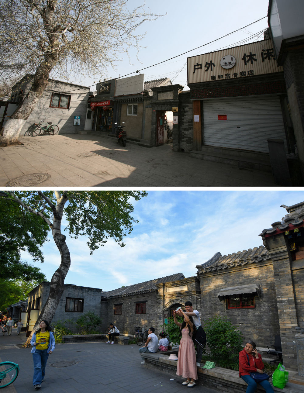 拼版照片:上圖為2018年6月8日拍攝的北京雍和宮大街40號(資料照片);下圖為2024年5月11日拍攝的改造后的同一地點(diǎn)(新華社記者鞠煥宗攝)。新華社發(fā)