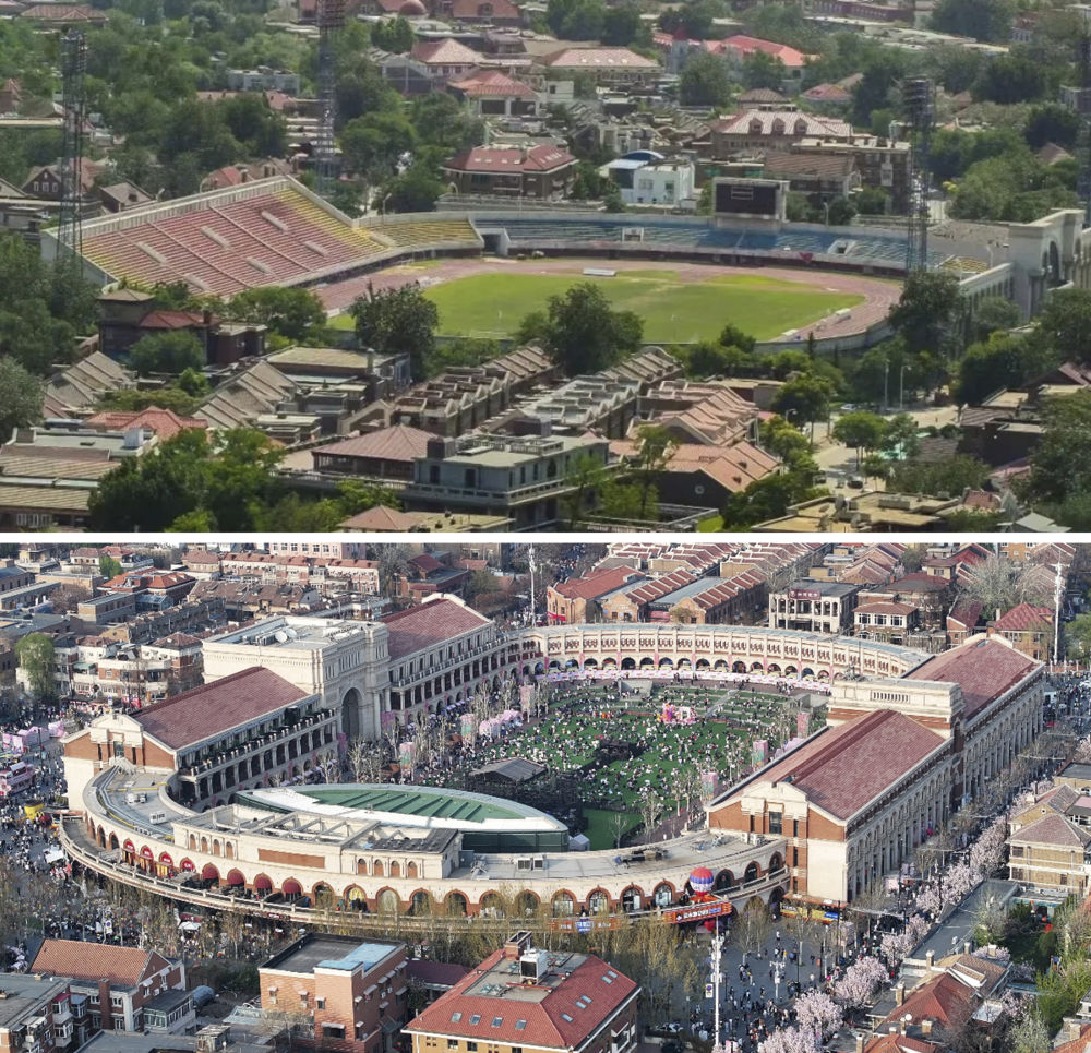 拼版照片:上圖是位于天津五大道的民園體育場(資料照片);下圖是2024年4月6日拍攝的民園廣場(新華社記者趙子碩攝)。民園廣場的前身是始建于1920年的民園體育場,曾是中國的第一個(gè)燈光足球場。經(jīng)過提升改造,現(xiàn)在的民園廣場已經(jīng)成為中西合璧的“城市會客廳”。新華社發(fā)