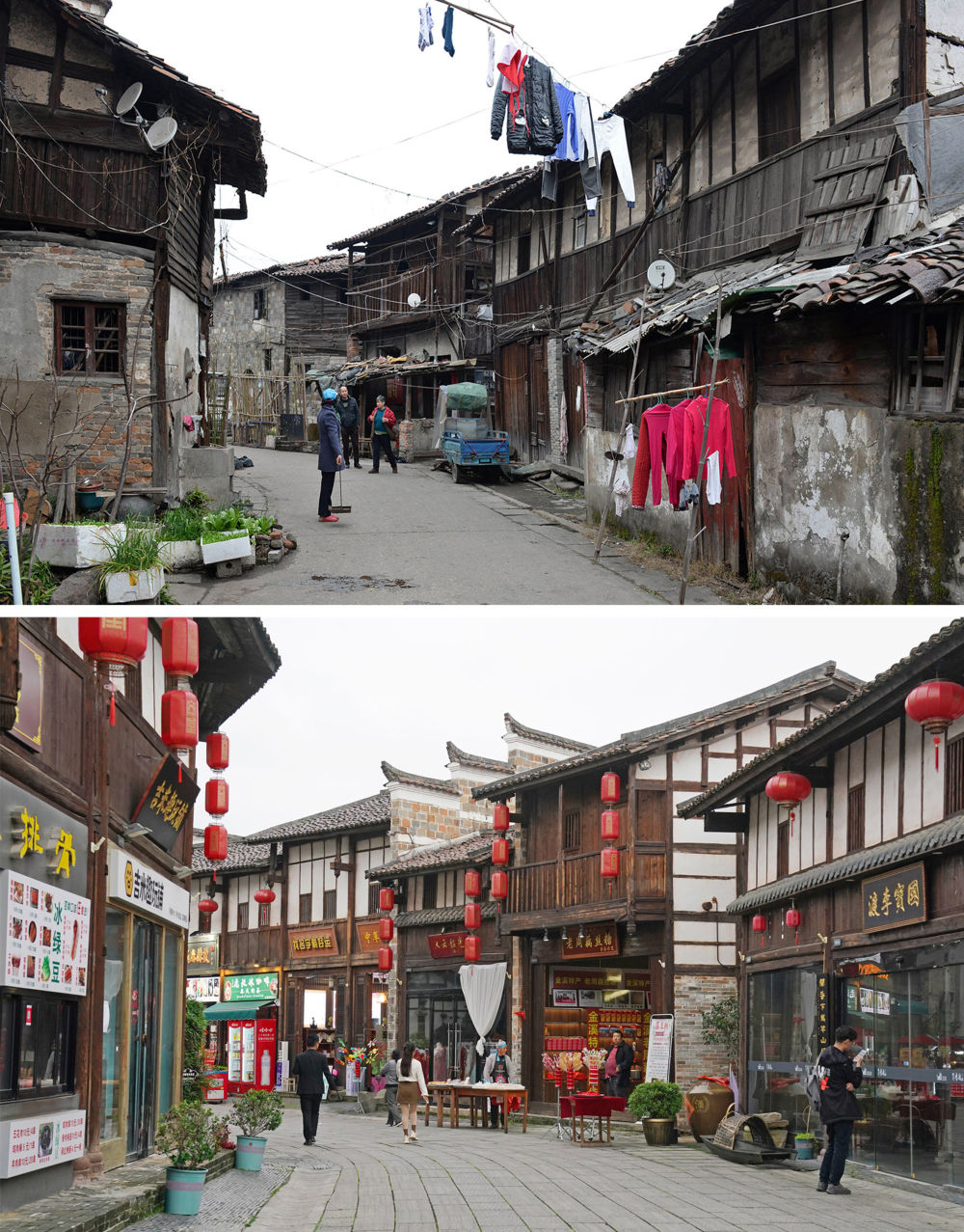 拼版照片:上圖為撫州文昌里歷史文化街區(qū)三角巷修繕前的樣貌(資料照片);下圖為同一地點(diǎn)修繕后的街景(2024年4月9日新華社記者萬象攝)。新華社發(fā)