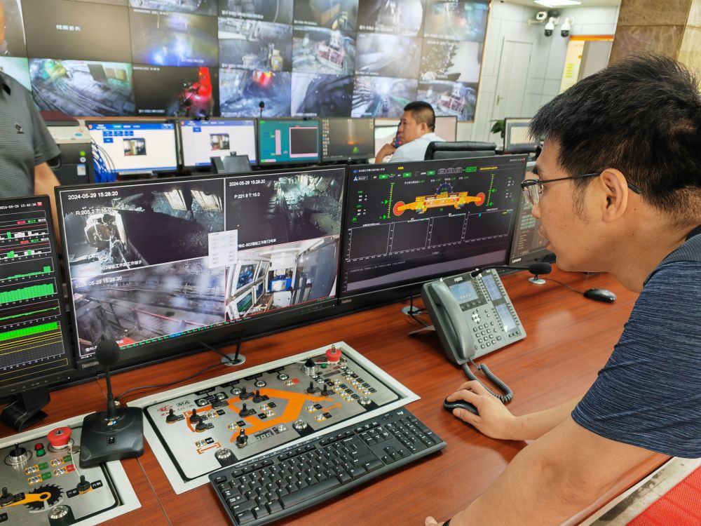 在山西省霍州市的山西焦煤集團李雅莊煤礦,綜采隊技術員在井上控制井下割煤機(2024年5月29日攝)。