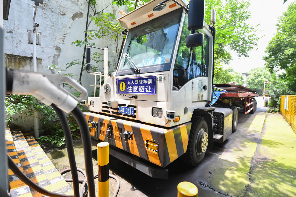 2024年6月13日,在湖南省湘潭市,一臺(tái)碼頭無(wú)人牽引車(chē)停靠在湘潭鋼鐵集團(tuán)有限公司的充電站。碼頭無(wú)人牽引車(chē)?yán)?G通信和北斗定位技術(shù),結(jié)合激光雷達(dá)和相機(jī)等傳感器對(duì)周?chē)沫h(huán)境進(jìn)行動(dòng)態(tài)的高精度建模,實(shí)時(shí)獲取牽引車(chē)與掛車(chē)的相對(duì)位置信息和環(huán)境信息。 新華社記者 陳澤國(guó) 攝