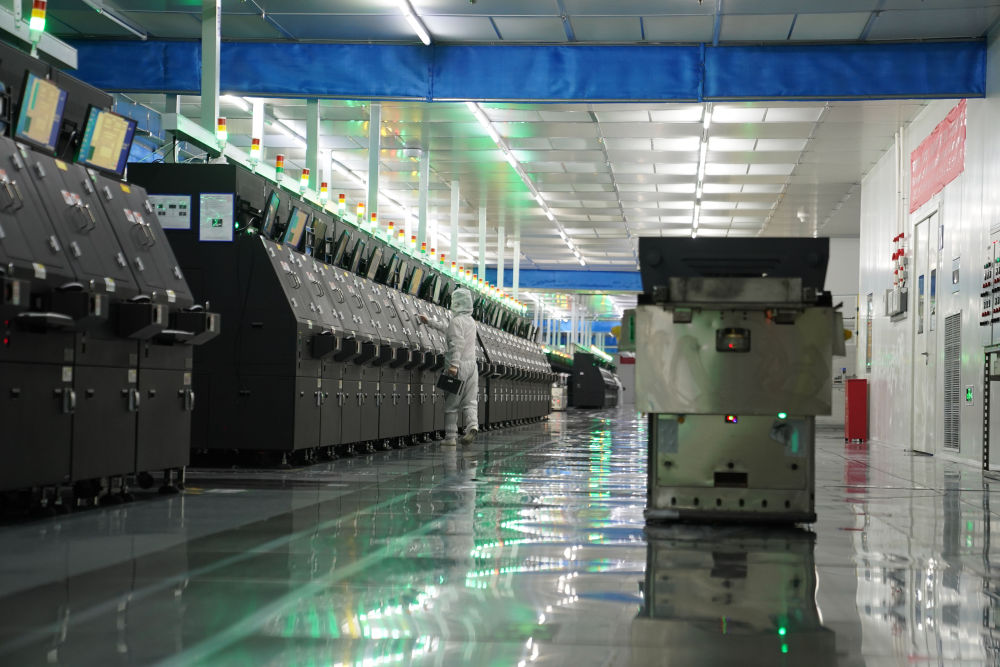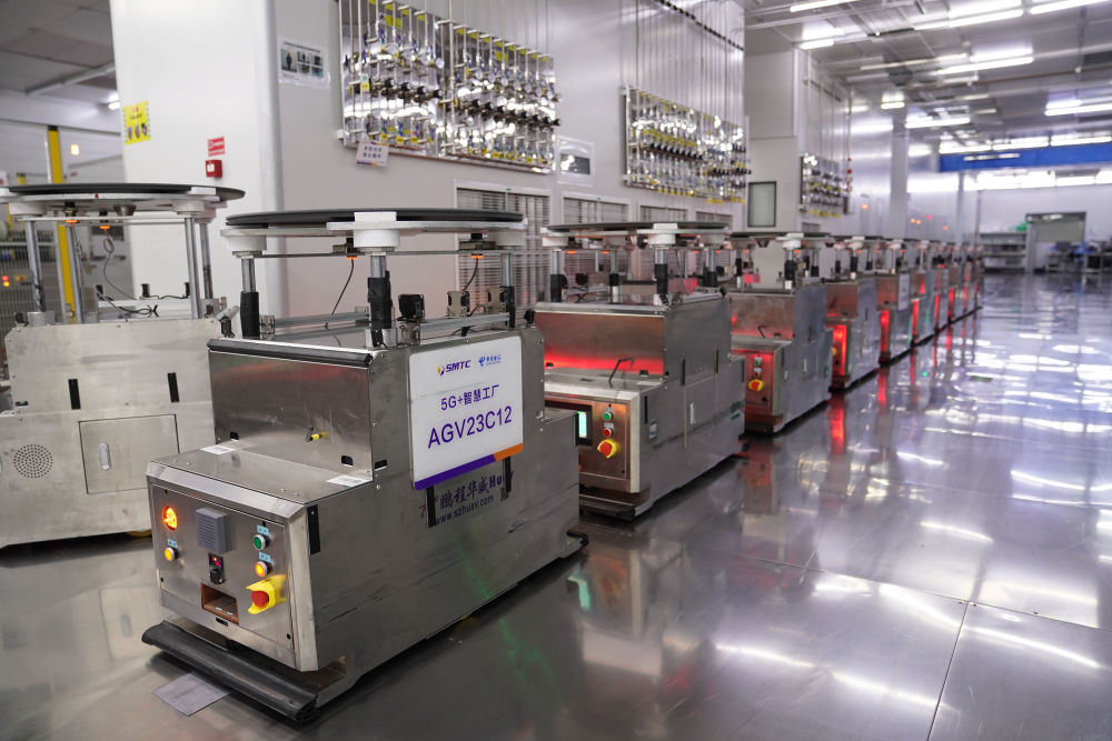2024年6月4日,在位于江西省南昌市高新區(qū)的江西兆馳半導(dǎo)體有限公司外延車(chē)間,AGV自動(dòng)轉(zhuǎn)運(yùn)小車(chē)在5G技術(shù)支持下進(jìn)行自動(dòng)搬運(yùn)。 新華社記者 周密 攝