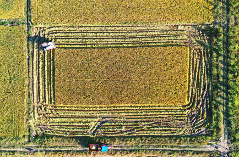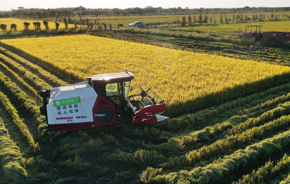 2022年10月11日,在江西省南昌縣大田農(nóng)社,無(wú)人駕駛收割機(jī)在收割成熟的水稻。無(wú)人駕駛收割機(jī)裝有精準(zhǔn)導(dǎo)航系統(tǒng),提高了收獲精度,降低了糧食損耗。 新華社記者 萬(wàn)象 攝