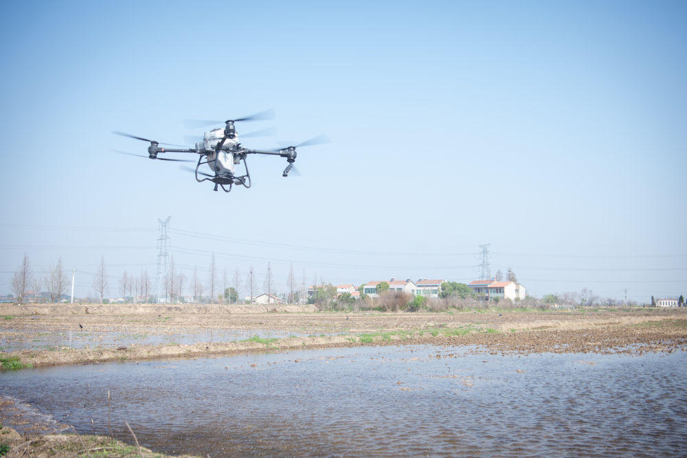 2023年3月15日,在湖北省武漢市黃陂區(qū)胡港灣村,武漢永旺農(nóng)產(chǎn)品專(zhuān)業(yè)合作社的植保無(wú)人機(jī)在播撒谷種。 新華社記者 伍志尊 攝