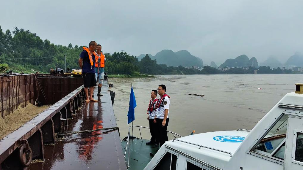 6月13日,柳州海事局執(zhí)法人員在融江融水二橋水域檢查船舶防汛值班情況。(楊鵬 攝)