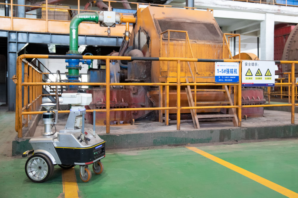生產(chǎn)現(xiàn)場(chǎng)無人化,依靠什么來實(shí)現(xiàn)?步入磨磁車間,巨大的轟鳴聲在這個(gè)長(zhǎng)約100米、寬約50米、高約30米的廠房?jī)?nèi)回響。登上二樓作業(yè)平臺(tái),兩臺(tái)直徑6.2米的大型球磨機(jī)上的轉(zhuǎn)輪正在飛速旋轉(zhuǎn)。不遠(yuǎn)處,磨磁巡檢機(jī)器人閃爍著燈光,正在采集設(shè)備溫度、振動(dòng)等狀態(tài)數(shù)據(jù)。