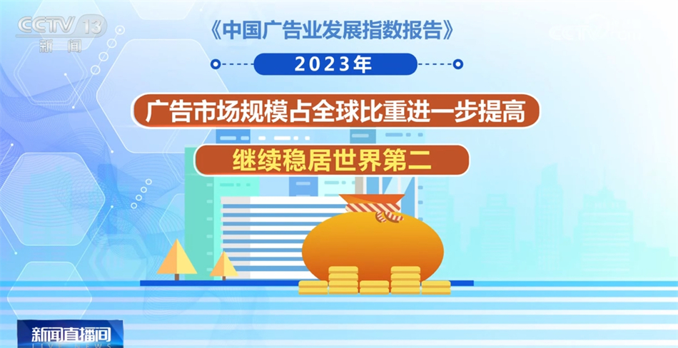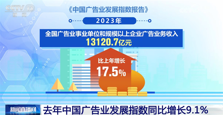 《中國廣告業(yè)發(fā)展指數(shù)報告》顯示,我國廣告業(yè)規(guī)??焖偬嵘a(chǎn)業(yè)活力不斷釋放。2023年,全國廣告業(yè)事業(yè)單位和規(guī)模以上企業(yè)廣告業(yè)務(wù)收入13120.7億元,比上年增長17.5%,廣告市場規(guī)模占全球比重進(jìn)一步提高,繼續(xù)穩(wěn)居世界第二。