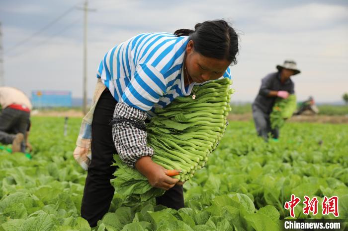 寧夏固原原州區(qū)冷涼蔬菜種植基地內,農戶采摘菜心。 固原市委宣傳部供圖