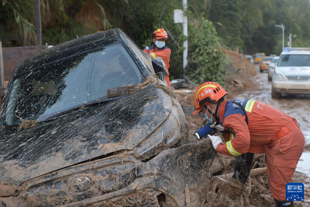 救援人員在廣東省梅州市平遠(yuǎn)縣泗水鎮(zhèn)開(kāi)展救援工作(6月20日攝)。新華社記者 盧漢欣 攝