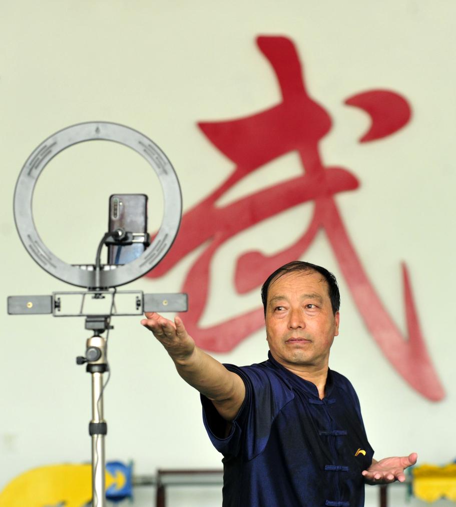 2020年11月19日,六合拳傳承人石同鼎(下)在河北滄州泊頭西關回民小學帶領學生們練習六合拳。