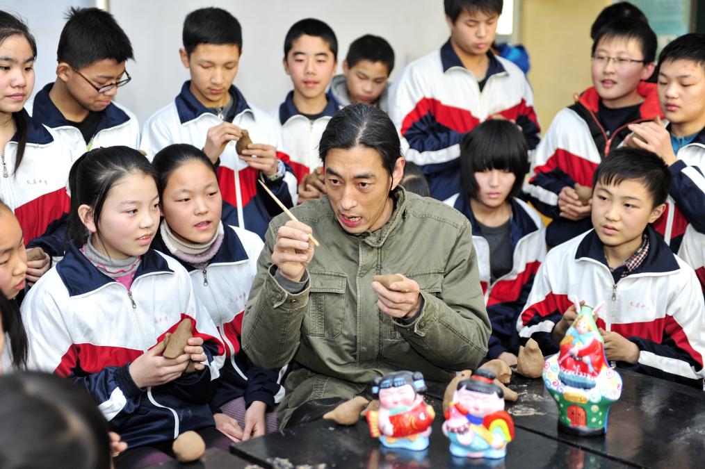2015年1月9日,在河北省泊頭市文廟中學,“三癡齋”泥塑傳承人宋長峰(前中)在教學生們制作鳥哨。
