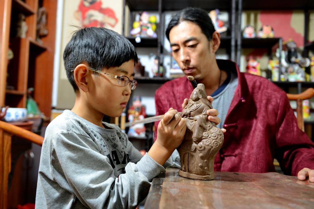 2014年10月22日,“三癡齋”泥塑傳承人宋長峰指導兒子進行泥塑制作。