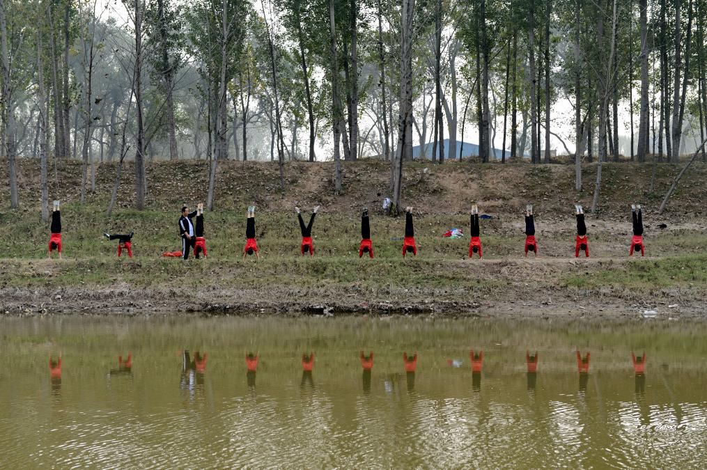 2014年10月24日,吳橋國際雜技藝術學校的學生們在大運河邊練功。