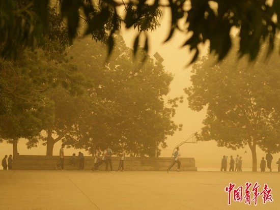 這時(shí)候,學(xué)生們?nèi)哉驹诓賵?chǎng)上說(shuō)話,上課鈴響了,才慢慢踱回樓里。學(xué)校外面,路邊的人就坐在沙霧里吃燒烤,出租車大敞著窗戶載客,騎電動(dòng)車的人偶爾瞇起眼睛,沙子打得臉疼,也絕不戴口罩。之后,人們像掃雪一樣,耐心地掃去門口、窗臺(tái)上的沙土。