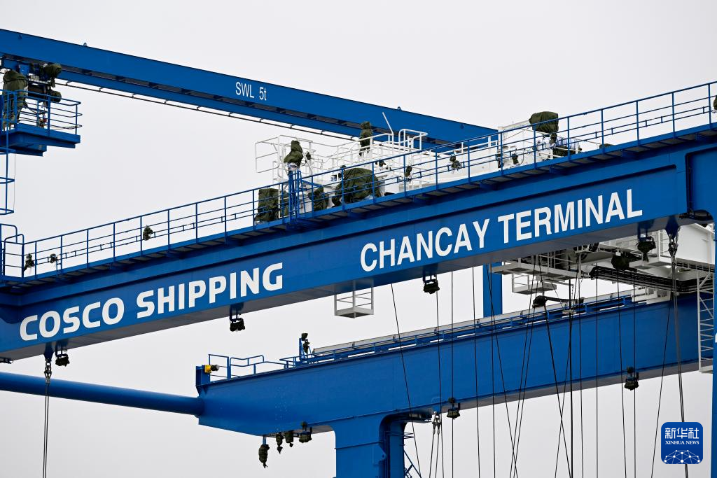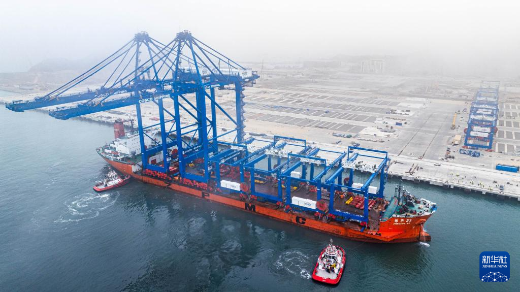 6月27日,岸邊集裝箱起重機和軌道吊運抵秘魯錢凱港。 新華社發(fā)(上海振華重工供圖)