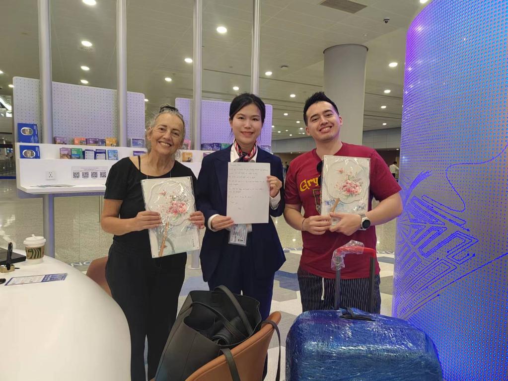 上海浦東機場T2航站樓的外籍人員一站式綜合服務(wù)中心近日建成投用,按照支付、文旅、通信、交通四個模塊功能,為外籍人員提供便利化服務(wù)。南非游客艾利克斯在此辦理短期通信卡后寫下留言:“中國讓入境游客體驗到更多便利,這讓我們非常開心。上海電信的工作人員還送上兩把中國扇子用以緩解暑熱?!?/p>