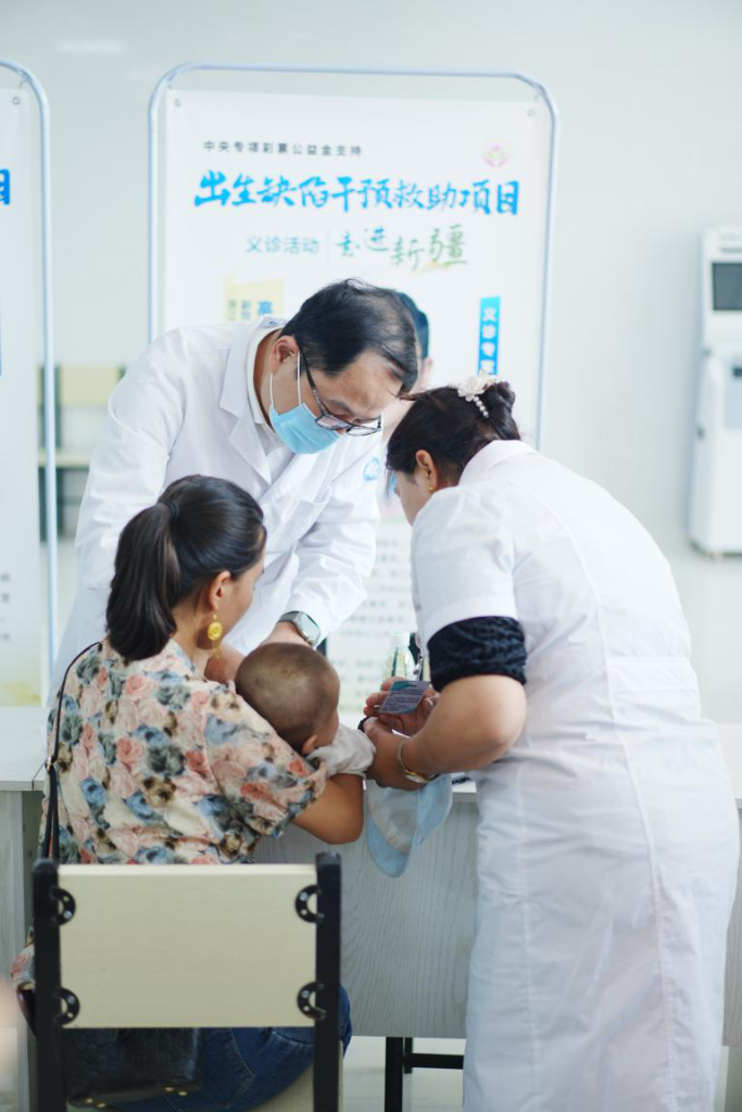 2023年8月,新疆和田縣人民醫(yī)院,專家正在為當(dāng)?shù)氐某錾毕莼純毫x診。(中國(guó)出生缺陷干預(yù)救助基金會(huì)供圖)