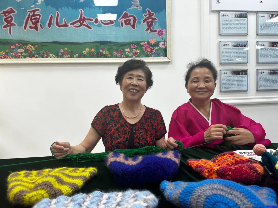 民族工藝傳承區(qū)里,志愿者高娃帶領(lǐng)圍坐桌前的“同學(xué)們”編織各類毛線織品,絲線繡出來的花鳥圖案引起記者們的注意。朝鮮族居民李貞子和漢族居民劉海燕是“老搭檔”,屬于“零基礎(chǔ)”學(xué)員的她們連續(xù)多年堅(jiān)持每周上課,即便沒有課程也會來活動中心相互切磋。現(xiàn)在,課堂上教過的各式民族工藝織品,二人都能信手拈來。