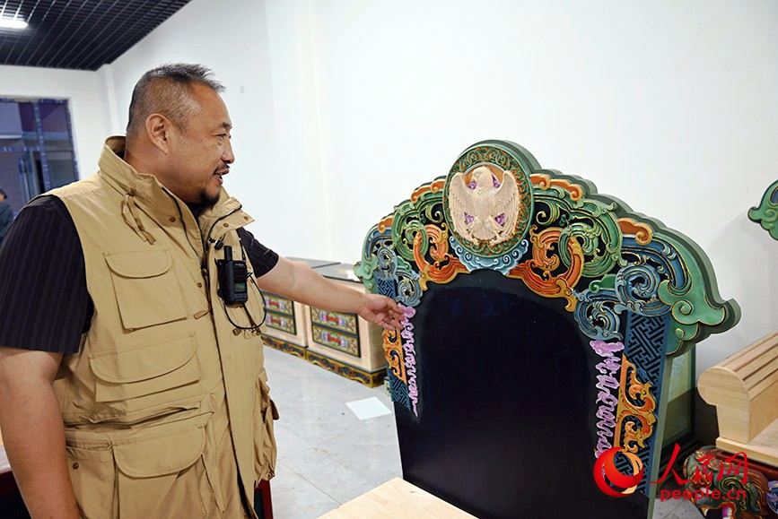 聞都蘇向記者介紹蒙古族家具制作。人民網記者 劉藝琳攝