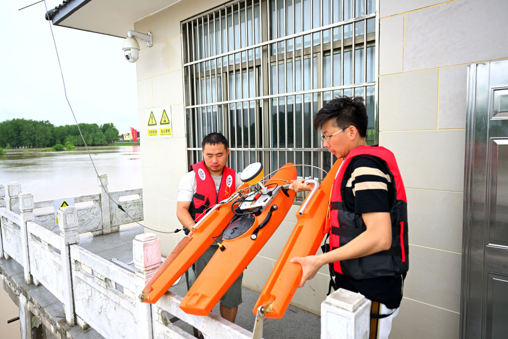 7月14日,王家壩水文站工作人員使用多普勒流速剖面儀測(cè)量淮河流量。新華社記者黃博涵 攝