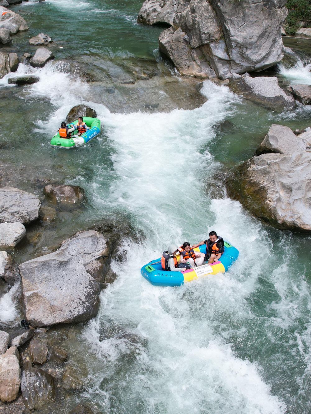 7月13日,游客在貴州省黔東南苗族侗族自治州施秉縣杉木河景區(qū)漂流(無人機照片)。新華社發(fā)(磨桂賓攝)