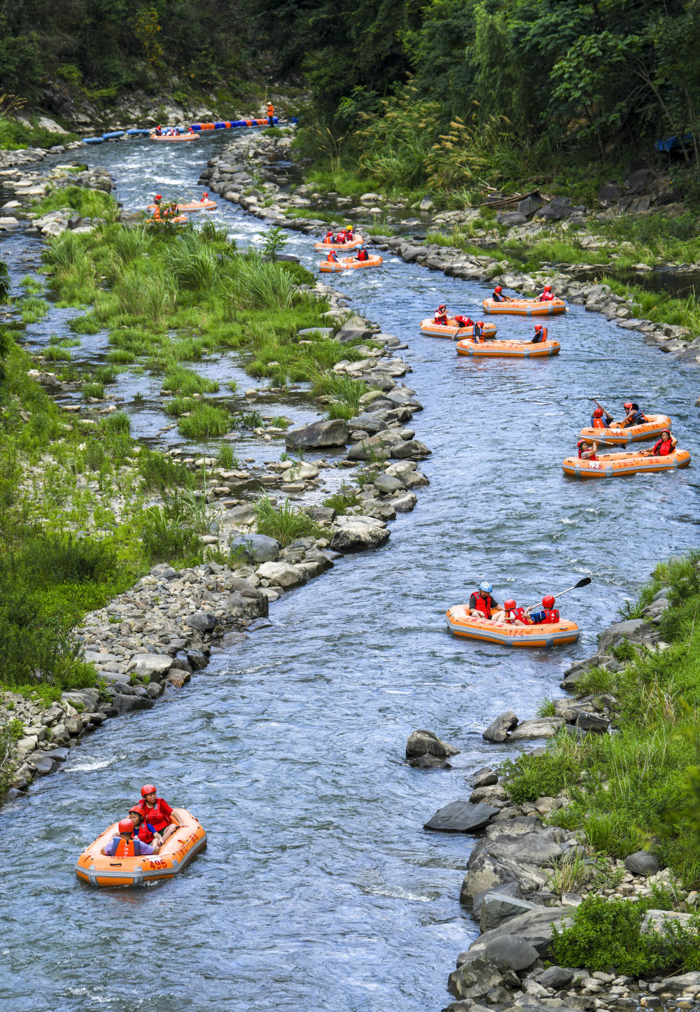 7月14日,游客在湖南省常寧市塔山瑤族鄉(xiāng)西江漂流景區(qū)漂流。新華社發(fā)(周秀魚春攝)