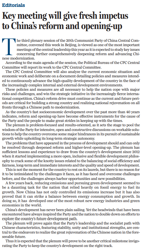 中國共產(chǎn)黨第二十屆中央委員會第三次全體會議本周在北京召開,將對進一步全面深化改革、 推進中國式現(xiàn)代化作出戰(zhàn)略部署。