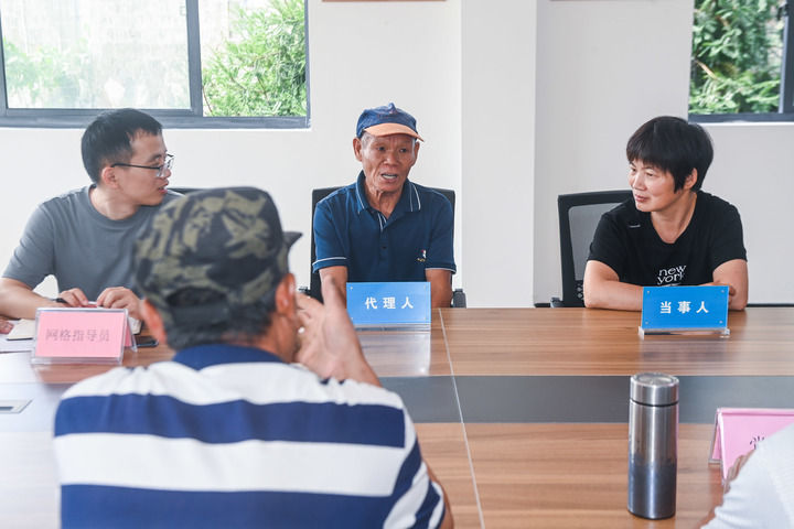 2023年7月26日,在浙江省諸暨市東白湖鎮(zhèn)婁東村新時(shí)代文明實(shí)踐站的文明共富會(huì)客廳內(nèi),網(wǎng)格長(zhǎng)召集村里矛盾雙方當(dāng)事人以及黨員代表、鄉(xiāng)賢代表、人大代表等成員進(jìn)行宅基地指標(biāo)糾紛的現(xiàn)場(chǎng)調(diào)解。新華社記者 徐昱 攝