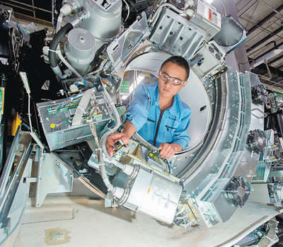 北京經(jīng)濟技術(shù)開發(fā)區(qū)永昌北路1號,通用電氣醫(yī)療北京影像設(shè)備制造基地(以下簡稱“北京生產(chǎn)基地”),生產(chǎn)線上機器轟鳴,一臺臺醫(yī)療器械陸續(xù)完成裝配。通用電氣醫(yī)療在全球銷售的每三臺CT機中就有2臺產(chǎn)自這里,產(chǎn)品銷往全球100多個國家和地區(qū)。