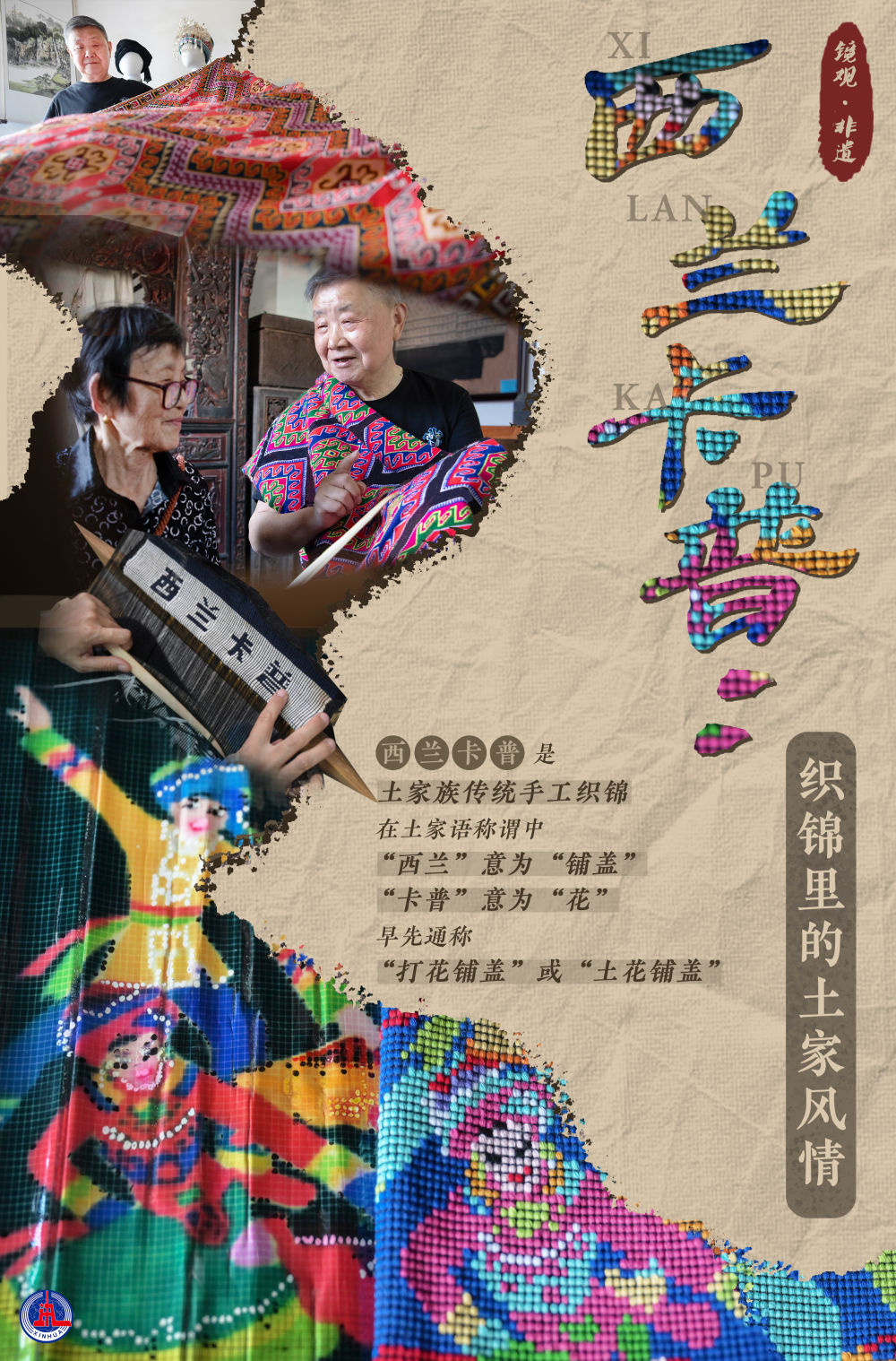 西蘭卡普是土家族傳統(tǒng)手工織錦,在土家語(yǔ)稱謂中,“西蘭”意為鋪蓋,“卡普”意為花,早先通稱“打花鋪蓋”或“土花鋪蓋”。土家孩子出生時(shí)外婆要送織錦,嬰幼兒時(shí)要蓋織錦,女孩子自小學(xué)習(xí)織錦,出嫁時(shí)在織機(jī)上制作西蘭卡普作為陪嫁。西蘭卡普記錄了土家族的風(fēng)俗和情感,與土家人的生活息息相關(guān),被譽(yù)為土家族的“五彩活化石”,2006年被列入國(guó)家級(jí)非物質(zhì)文化遺產(chǎn)名錄。