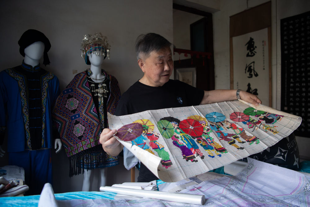 7月2日,湖北省來(lái)鳳縣桂花樹(shù)社區(qū),唐洪祥在家中展示西蘭卡普?qǐng)D紙。