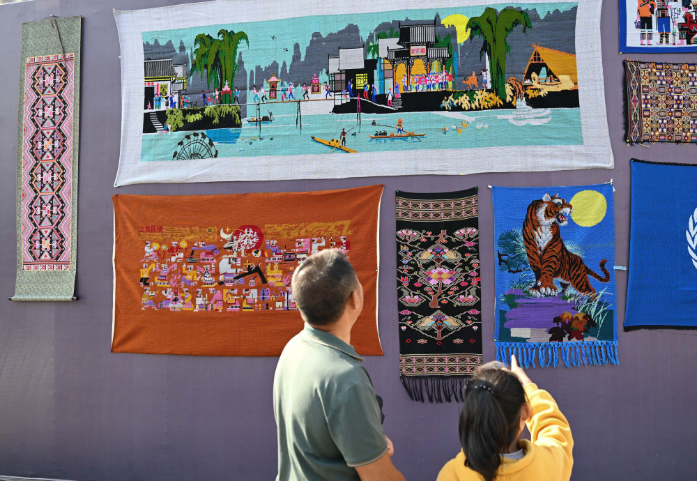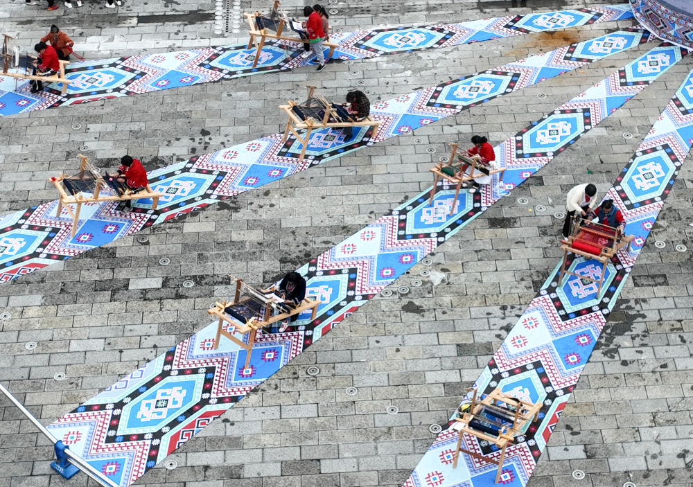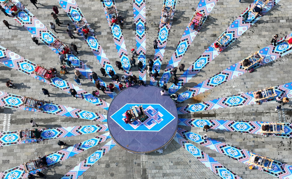 織錦女工在來(lái)鳳縣龍鳳文化中心廣場(chǎng)現(xiàn)場(chǎng)制作西蘭卡普,展示非遺技藝(2023年10月28日攝,無(wú)人機(jī)照片)。