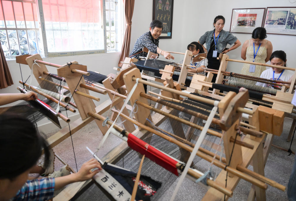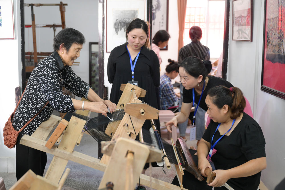 7月2日,唐洪祥的老伴劉秀琴(后左一)指導(dǎo)前來(lái)學(xué)藝的學(xué)員們操作織機(jī)。