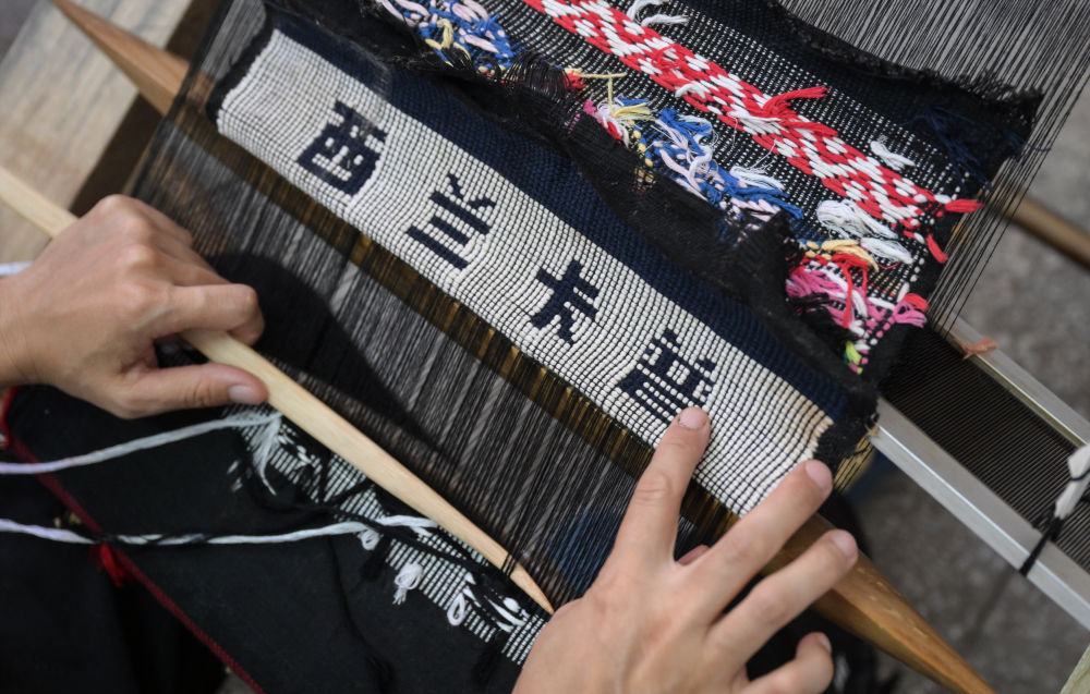 湖北省來(lái)鳳縣桂花樹(shù)社區(qū),一件“西蘭卡普”字樣的作品在織機(jī)上成形(7月2日攝)。