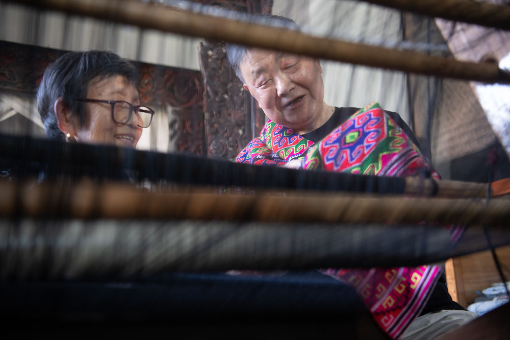 走進(jìn)這座名為土家織錦博物館的小樓,81歲的博物館負(fù)責(zé)人、國(guó)家級(jí)非遺傳承人唐洪祥和老伴劉秀琴在向大家講解示范土家織錦西蘭卡普的編織過(guò)程。