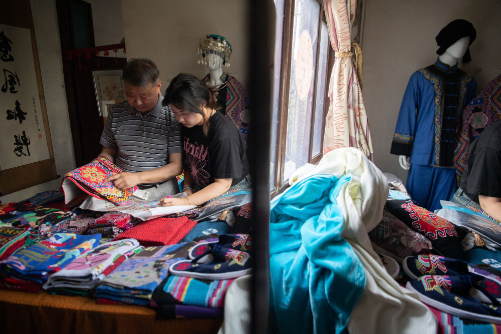 7月3日,湖北省來(lái)鳳縣桂花樹(shù)社區(qū),唐洪祥(左)與孫女唐鳴珂討論西蘭卡普?qǐng)D案。