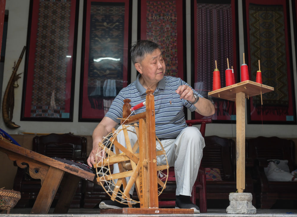 7月3日,湖北省來(lái)鳳縣桂花樹(shù)社區(qū),唐洪祥在紡線。