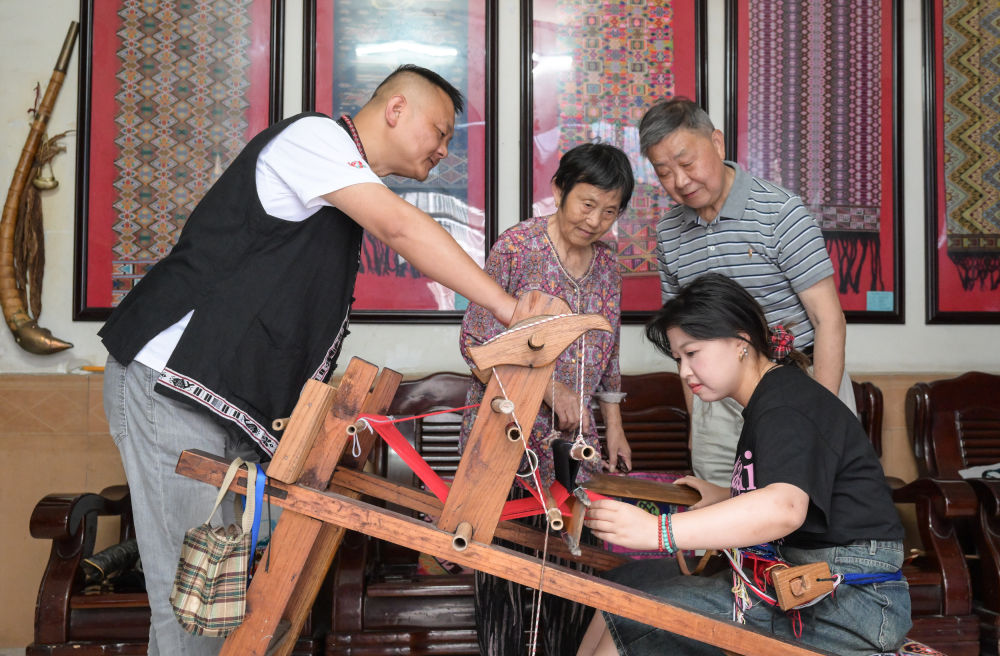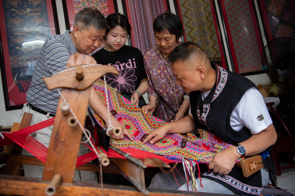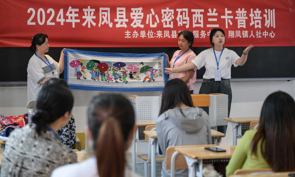 7月2日,唐洪祥的孫女唐鳴珂(后右一)在來(lái)鳳縣西蘭卡普培訓(xùn)班上展示西蘭卡普成品。今年29歲的唐鳴珂國(guó)外留學(xué)后回到家鄉(xiāng),從事西蘭卡普的傳承發(fā)展工作。