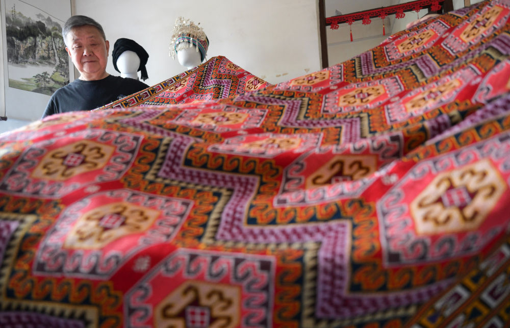 7月2日,湖北省來(lái)鳳縣桂花樹(shù)社區(qū),唐洪祥在整理一件大幅面西蘭卡普作品。