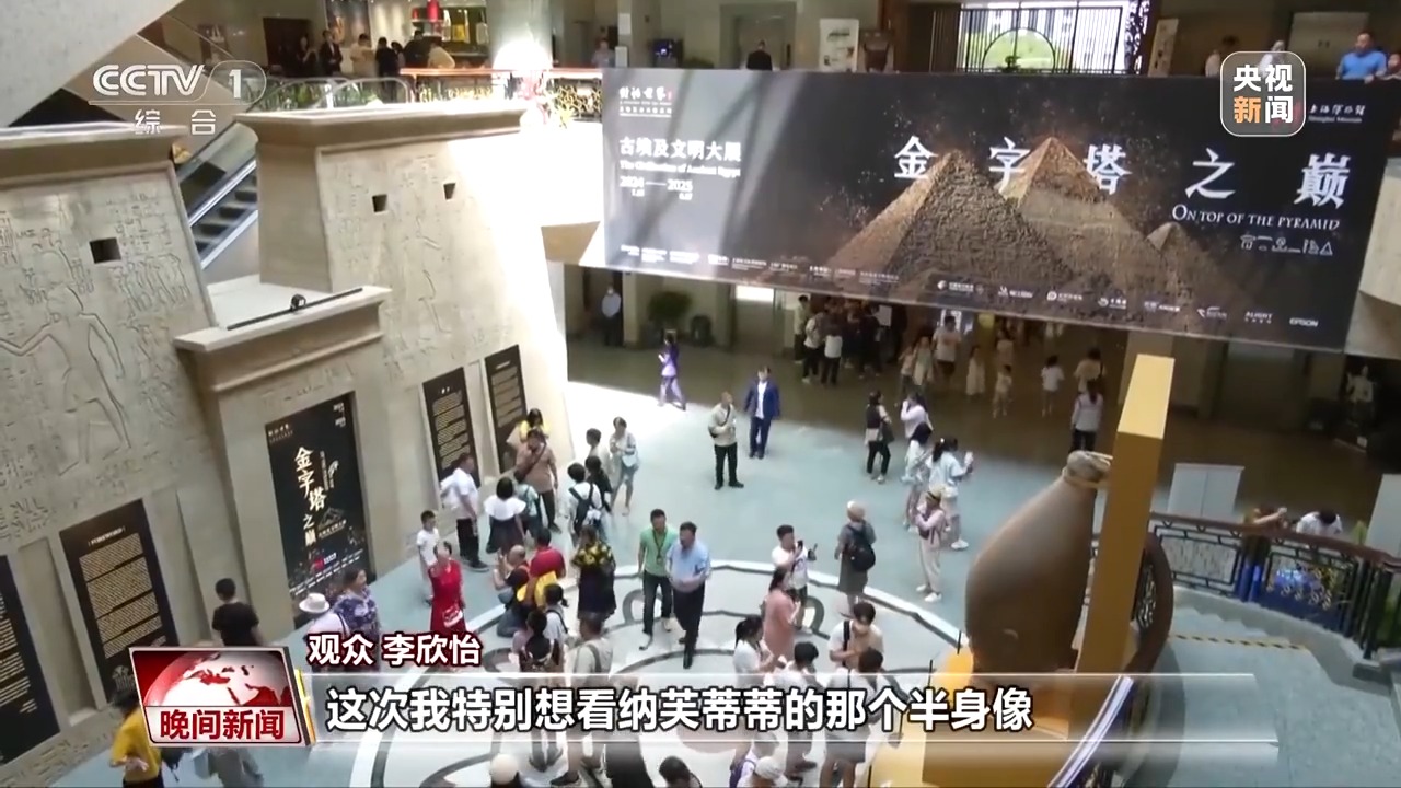 總臺記者 張倩:我現(xiàn)在所在的位置是上海博物館人民廣場館,19日是古埃及文明大展正式向公眾開放的首日,排起的長隊顯現(xiàn)了觀眾對于此次展覽的熱情。值得關(guān)注的是門口還擺放了一尊來自埃及盧克索博物館的法老雕像,這也是上博首次將文物放在室外進行展出。此外在旁邊的涼棚頂端,還有古埃及文字和符號??梢哉f,還沒有進入場館,已經(jīng)感受到了滿滿的埃及元素。