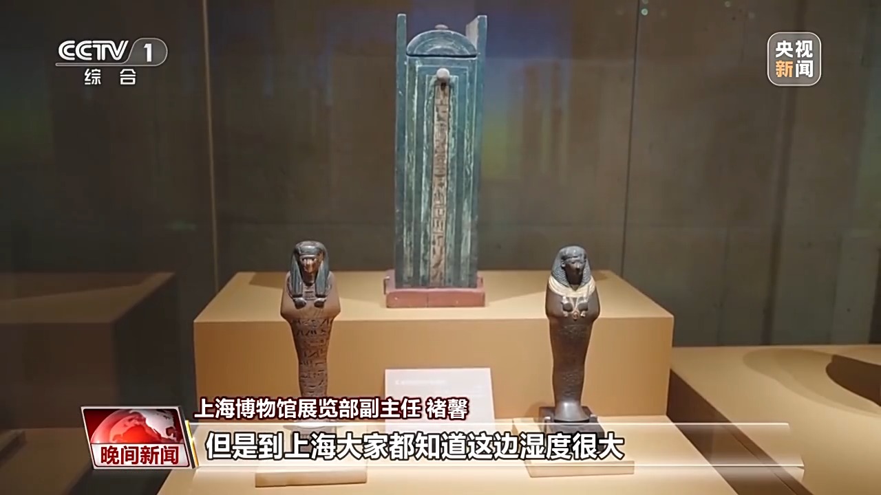 上海博物館展覽部副主任 褚馨:埃及的天氣比較干燥,它保存得特別好,但是到上海大家都知道這邊濕度很大,我們對它還進行了脫蟲的處理,全部處理好了以后,才放到恒溫恒濕的展柜當(dāng)中。