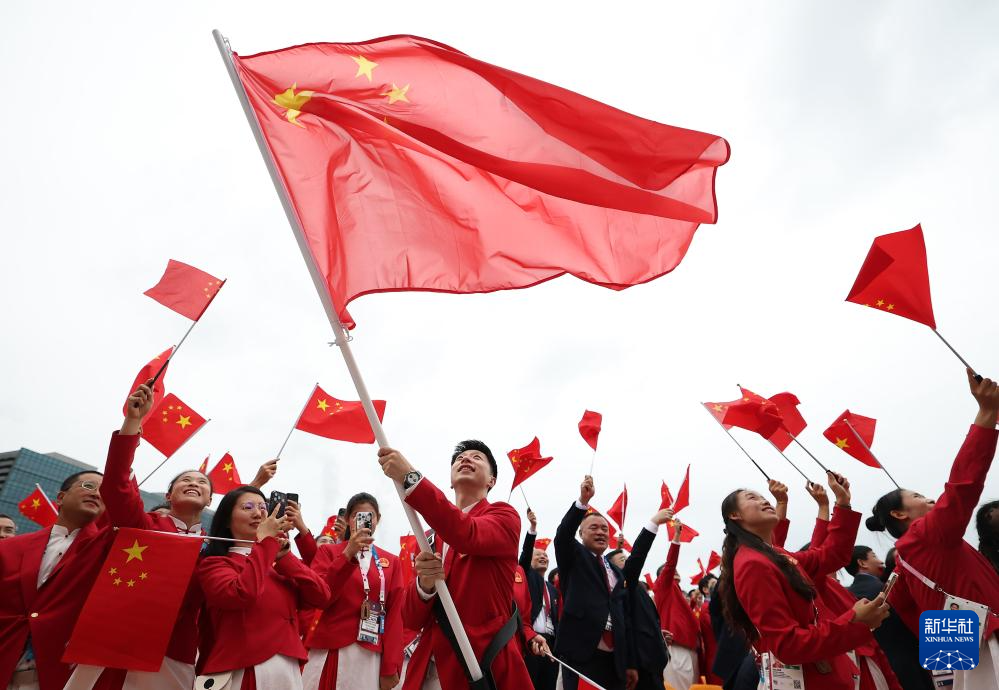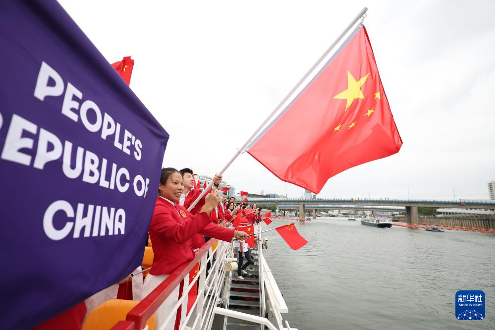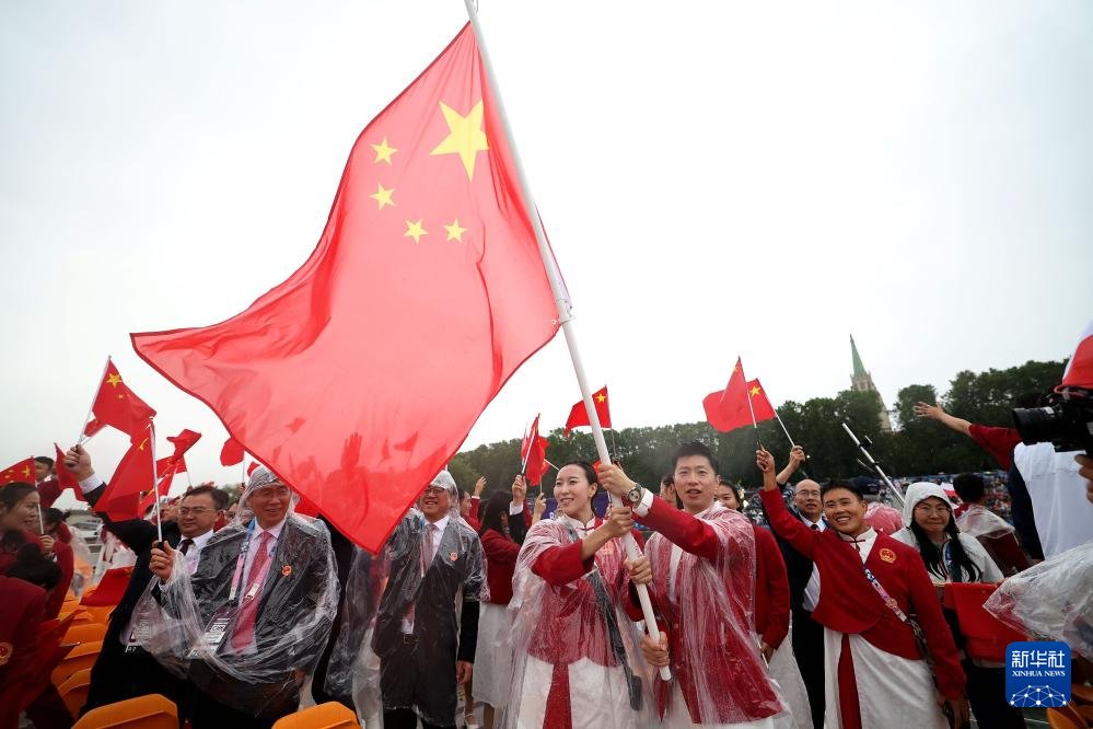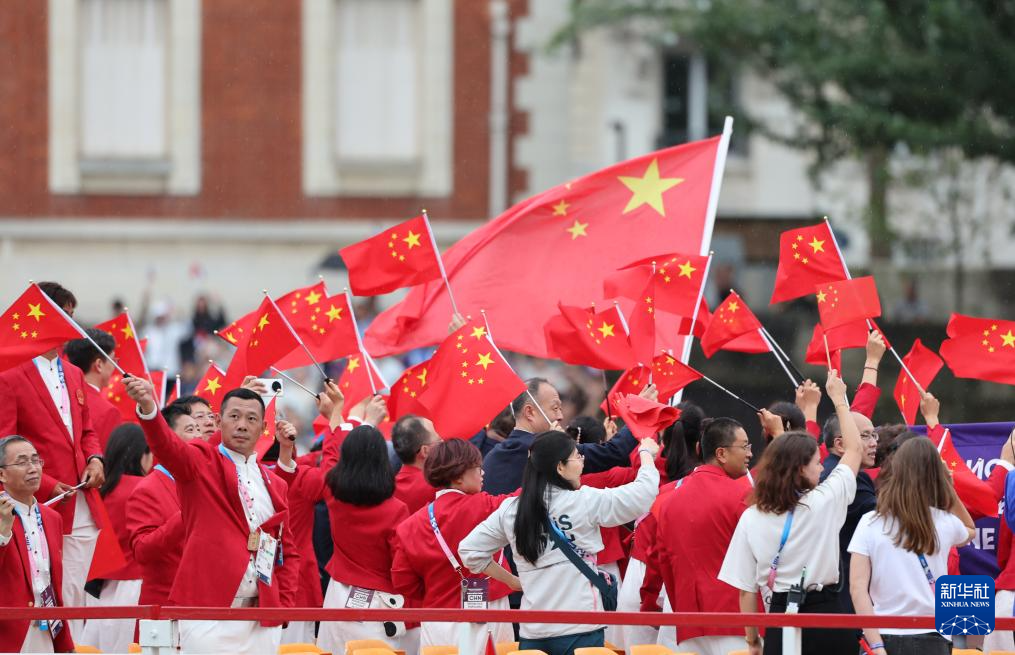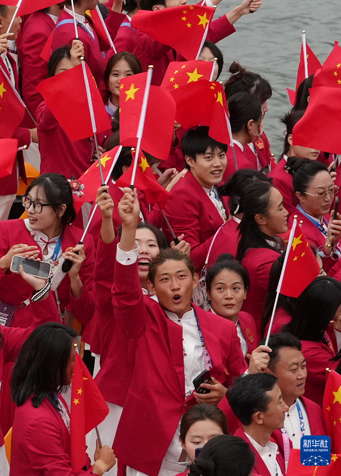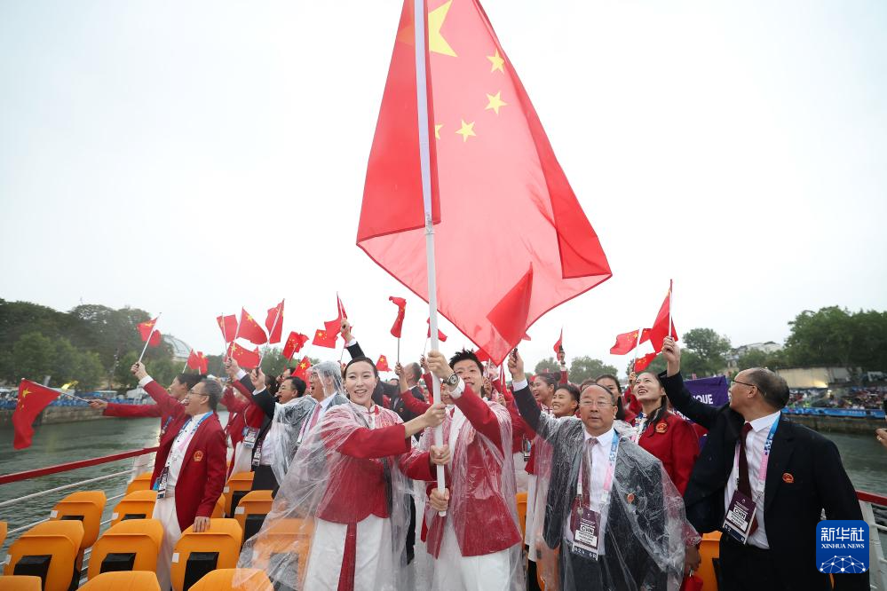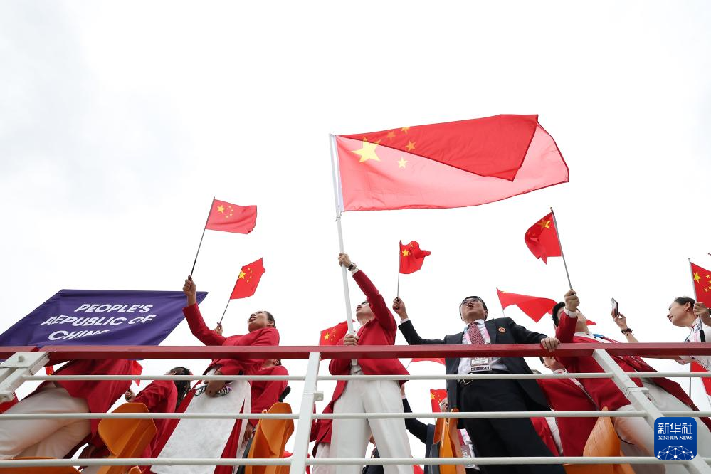 7月26日,中國體育代表團旗手、花樣游泳選手馮雨在開幕式上揮舞國旗。新華社記者 曹燦 攝