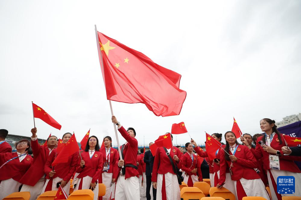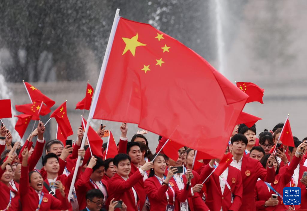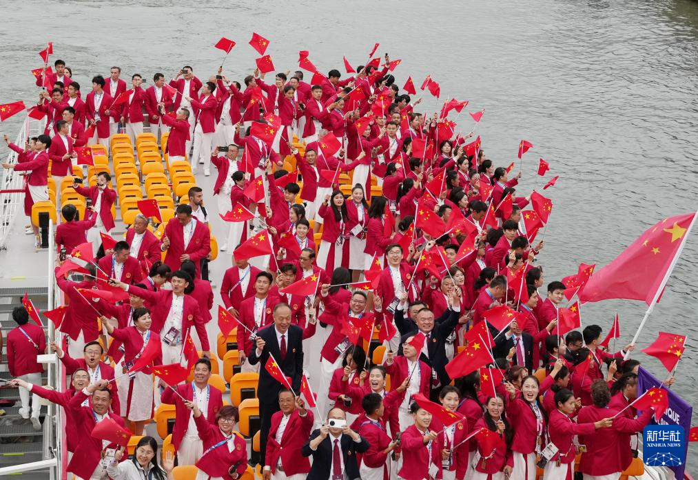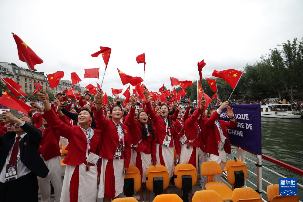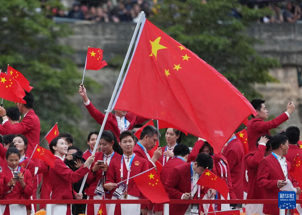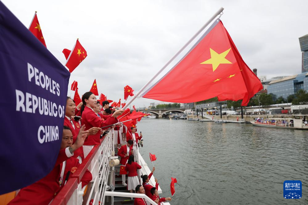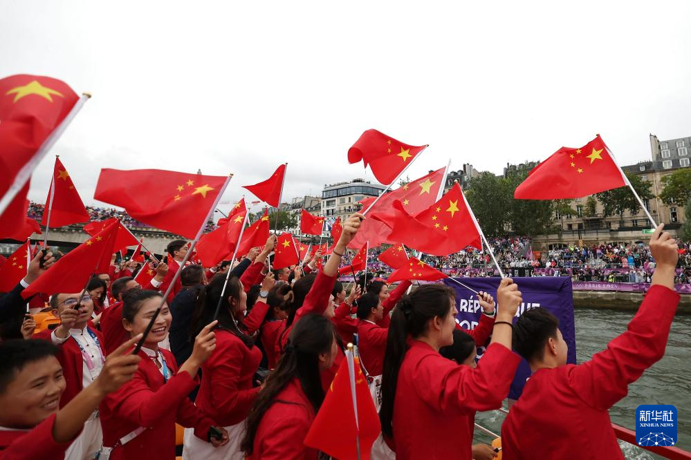 7月26日,中國體育代表團旗手、花樣游泳選手馮雨在開幕式上揮舞國旗。新華社記者 曹燦 攝