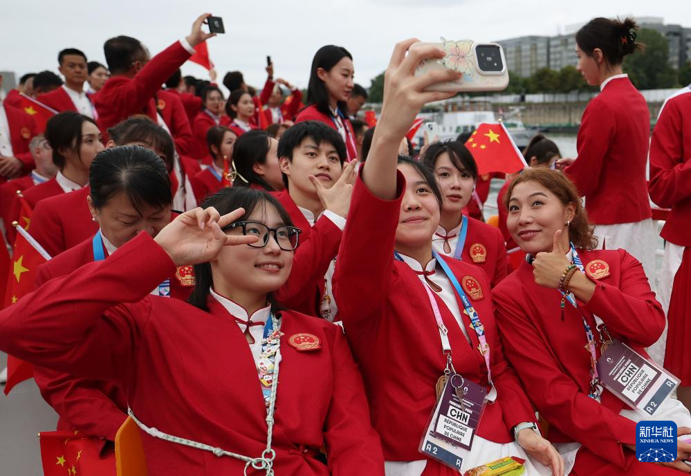 7月26日,中國體育代表團成員在開幕式前自拍留影。新華社記者 曹燦 攝