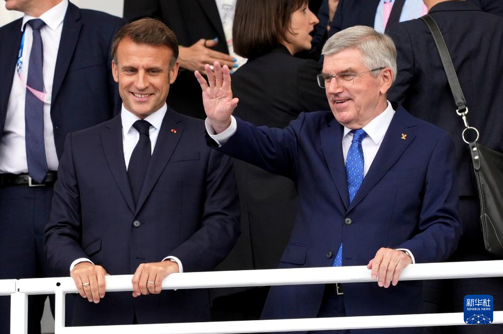 7月26日,國際奧委會主席巴赫(上左)和法國總統(tǒng)馬克龍出席開幕式。新華社記者 高靜 攝
