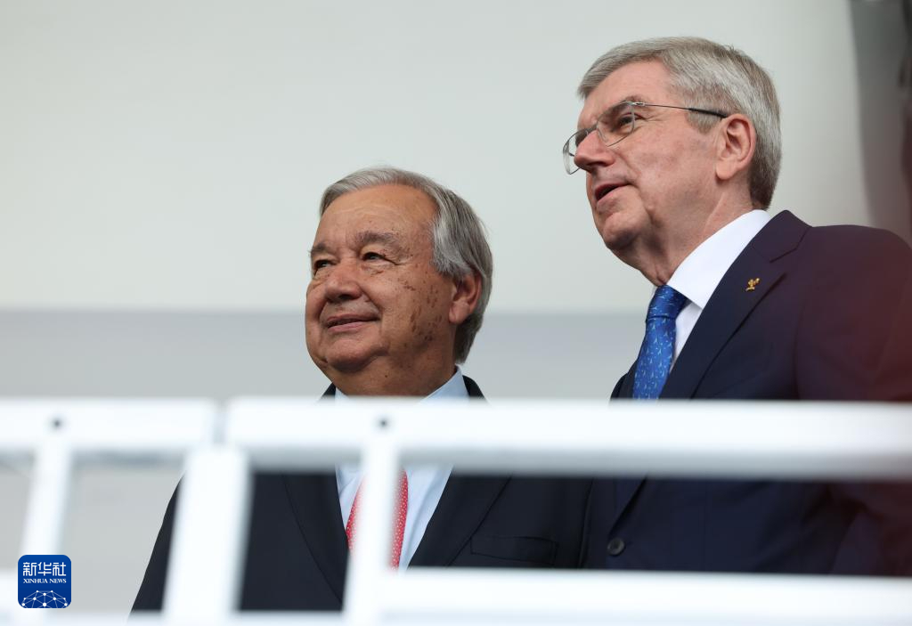 7月26日,國際奧委會主席巴赫(右)與聯(lián)合國秘書長古特雷斯出席開幕式。新華社記者 高靜 攝pagebreak