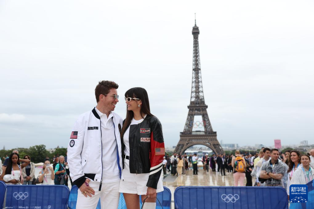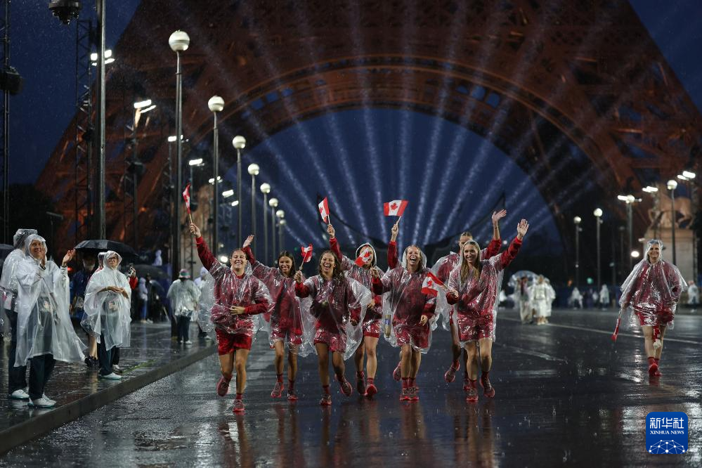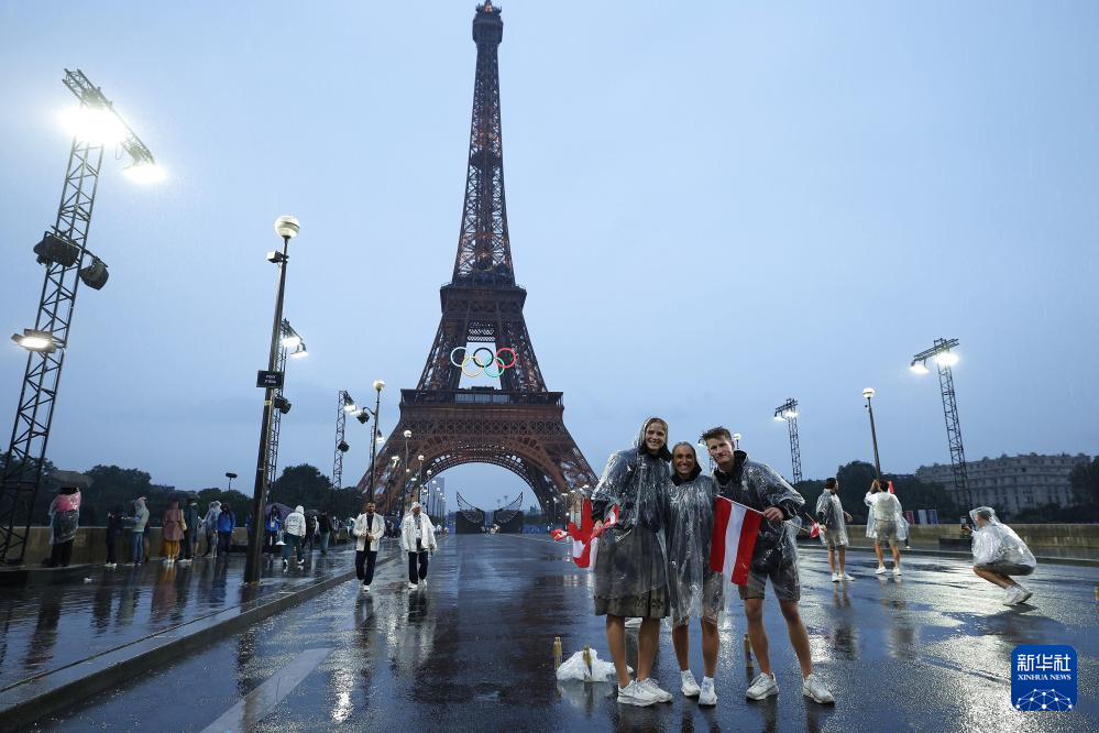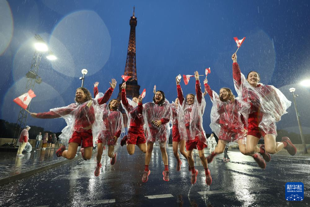 7月26日,加拿大體育代表團成員在埃菲爾鐵塔前。新華社記者 李明 攝