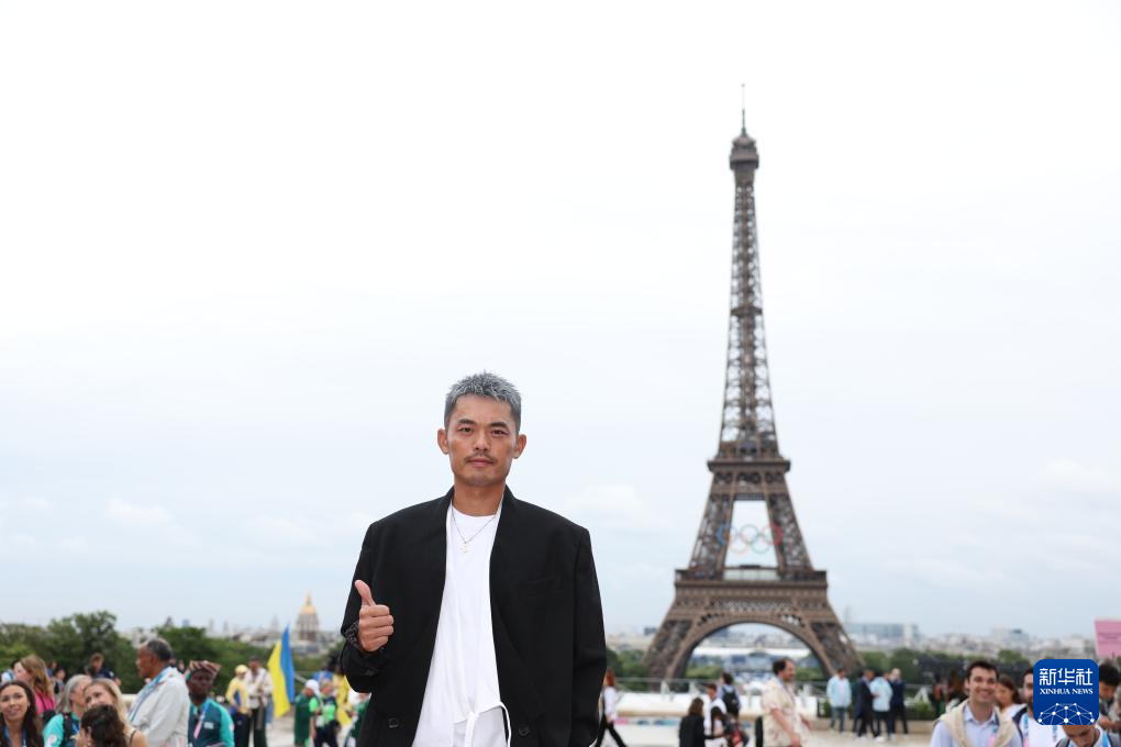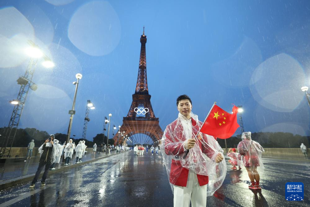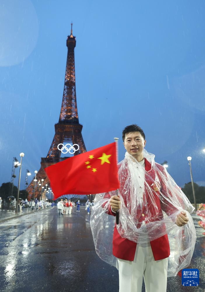 7月26日,中國體育代表團旗手、乒乓球選手馬龍在埃菲爾鐵塔前。新華社記者 李明 攝