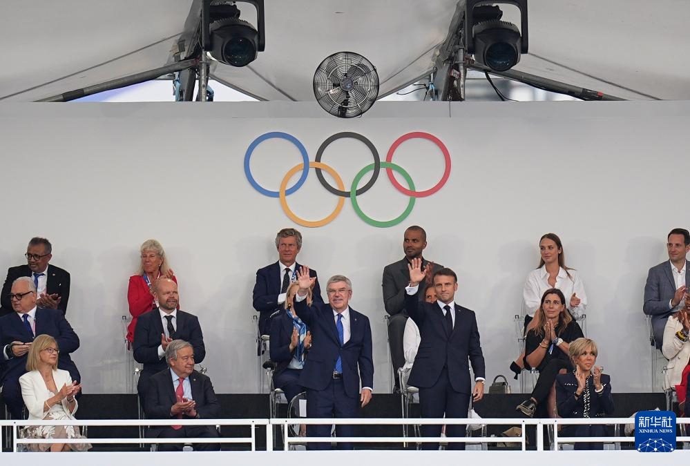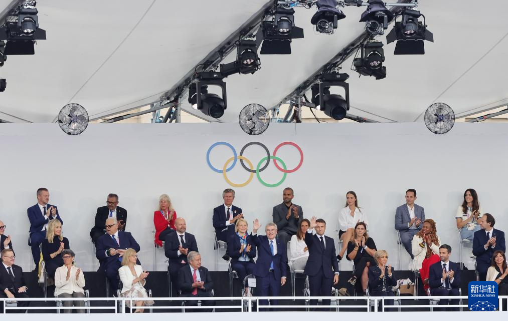 7月26日,國際奧委會主席巴赫(前排左五)和法國總統(tǒng)馬克龍(前排右四)出席開幕式。新華社記者 沈伯韓 攝